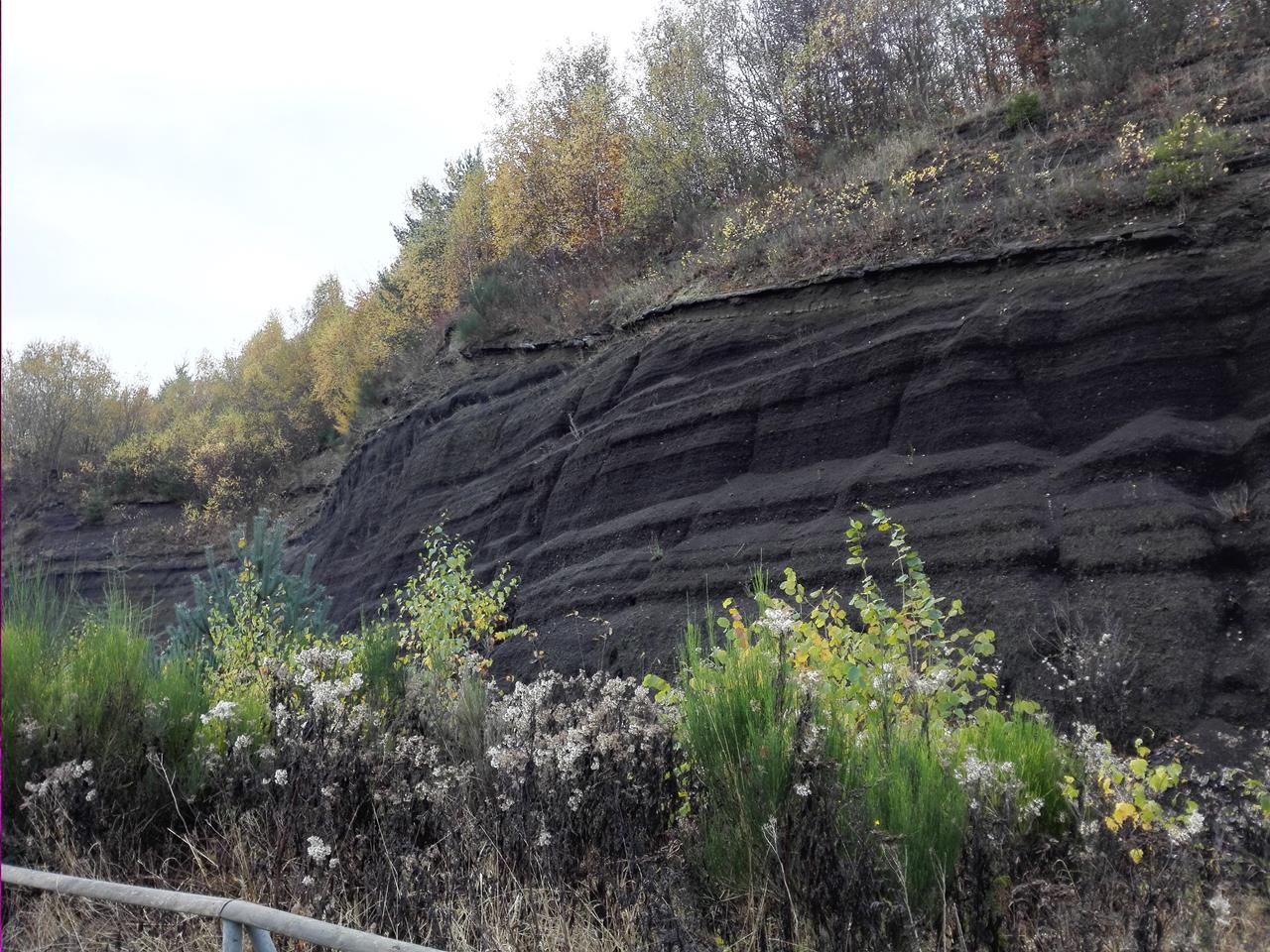 Nach einem kurzen Anstieg durch ein idyllisches Tal erblicken wir eine eindrucksvolle Aschewand, die der Laacher-See-Vulkan vor 13.000 Jahren hinterlassen hat,