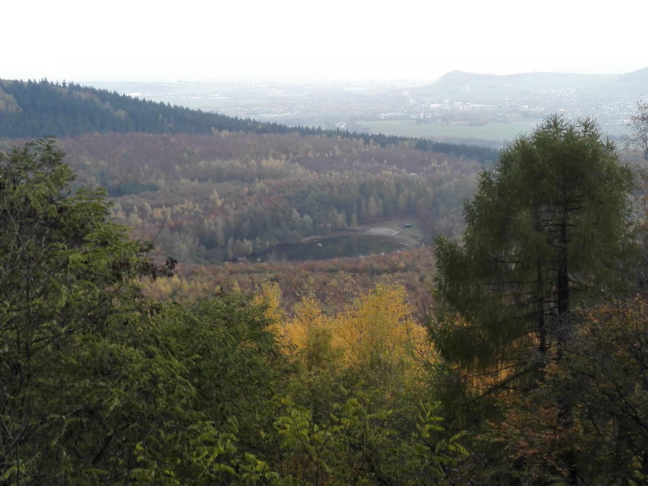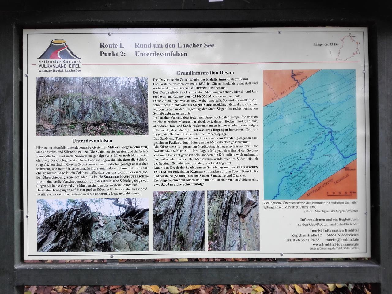 Wir passieren den hübschen Krufter Waldsee und beginnen den steilen Aufstieg zur „Teufelskanzel“, einem Felsvorsprung mit weitem Fernblick Richtung Kruft und Neuwieder Becken.