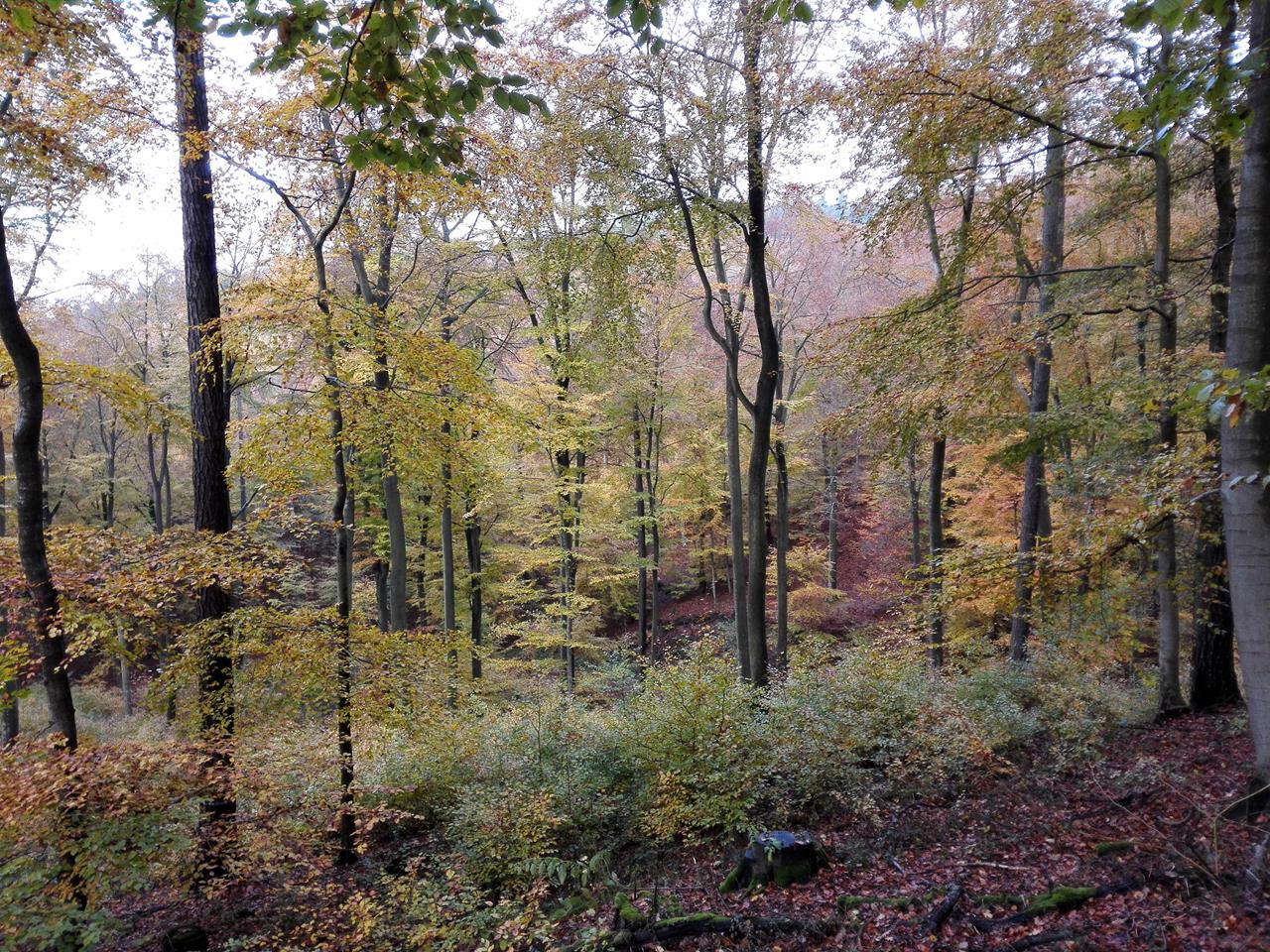 Anschließend geht es in Serpentinen abwärts durch einen mächtigen Buchenwald und über freies Feld zum Südufer des Laacher Sees. In der Ferne können wir das Kloster Maria Laach erblicken.