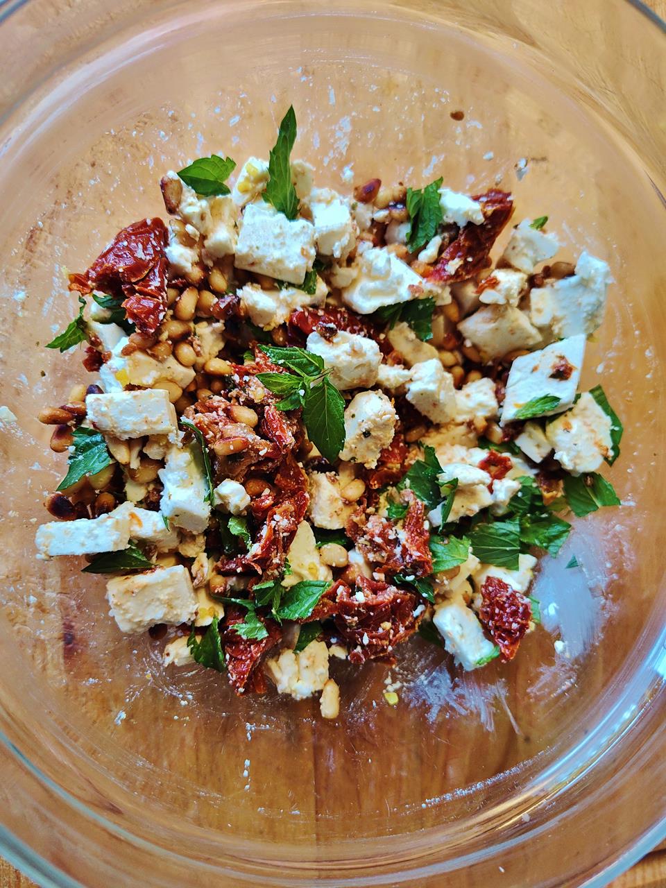 Die Zweite, etwas weniger massereiche Schicht wird aus getrockneten und in Öl eingelegten Tomaten gebildet, dazu kommt Fetakäse, geröstete Pinienkerne und frische Minzblätter – alles ein wenig kleingehackt.