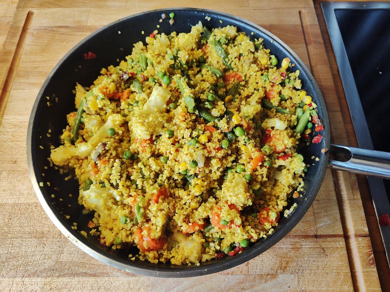 Der Bulgur wird anschließend mit dem in der Pfanne angebratenem Gemüse (Auswahl ganz nach Gusto) vermischt. Ich habe hier französisches Pfannengemüse plus etwas Blumenkohl und Stangenbohnen verwendet, alles aus der TK.