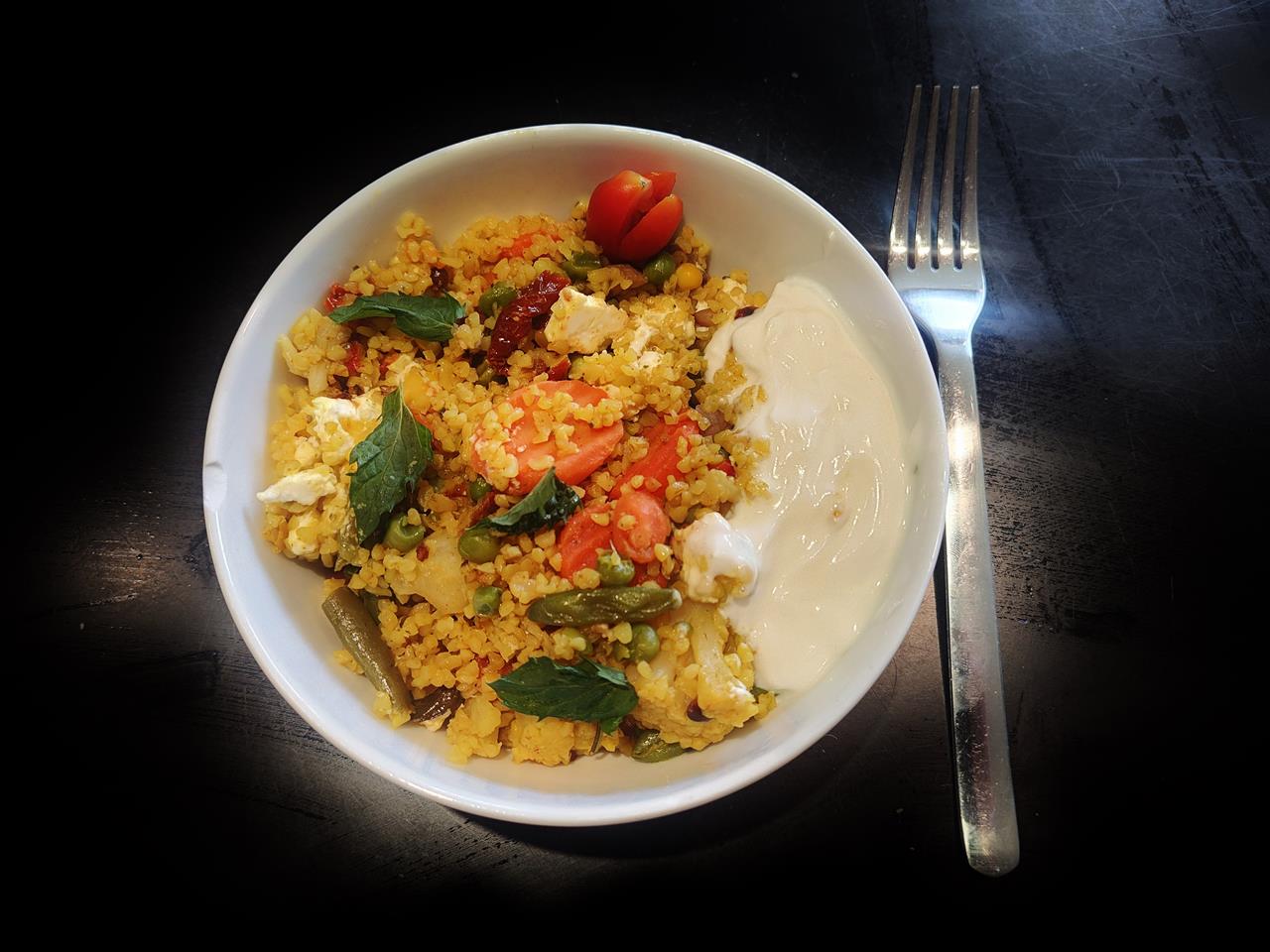 Die erste Schicht besteht aus Bulgur, das man übergossen mit Gemüsebrühe und orientalischen Gewürzen ca. 30 Minuten hat quellen lassen: Kurkuma, Curry, zerstoßenem Kardamom, gemahlenem Schwarzkümmel plus eine Prise Salz.