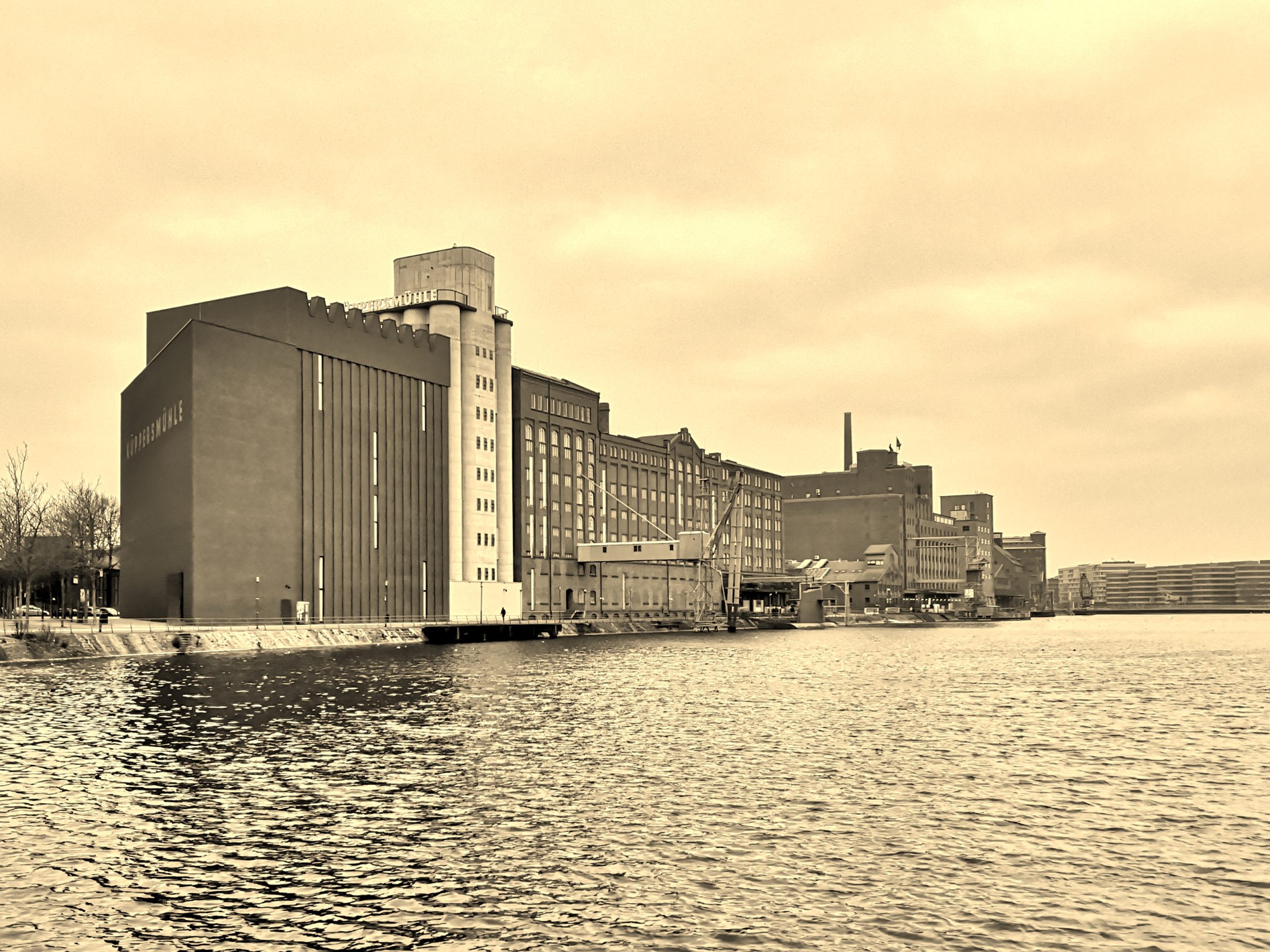 Links das alte Kesselhaus der Küppersmühle, in der Mitte das ehemalige Hauptgebäude mit dem Eingang und rechts der Museums-Anbau von 2021