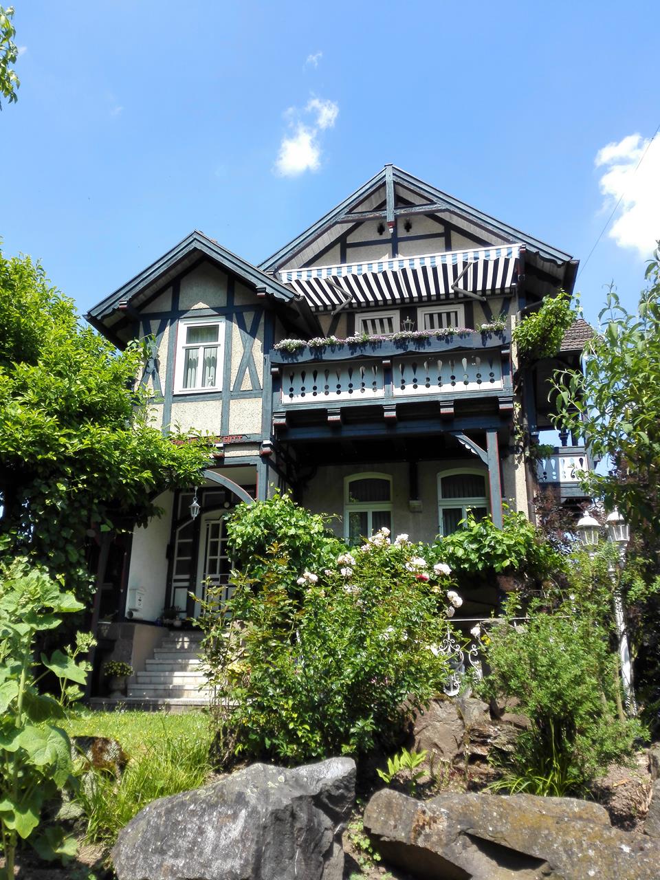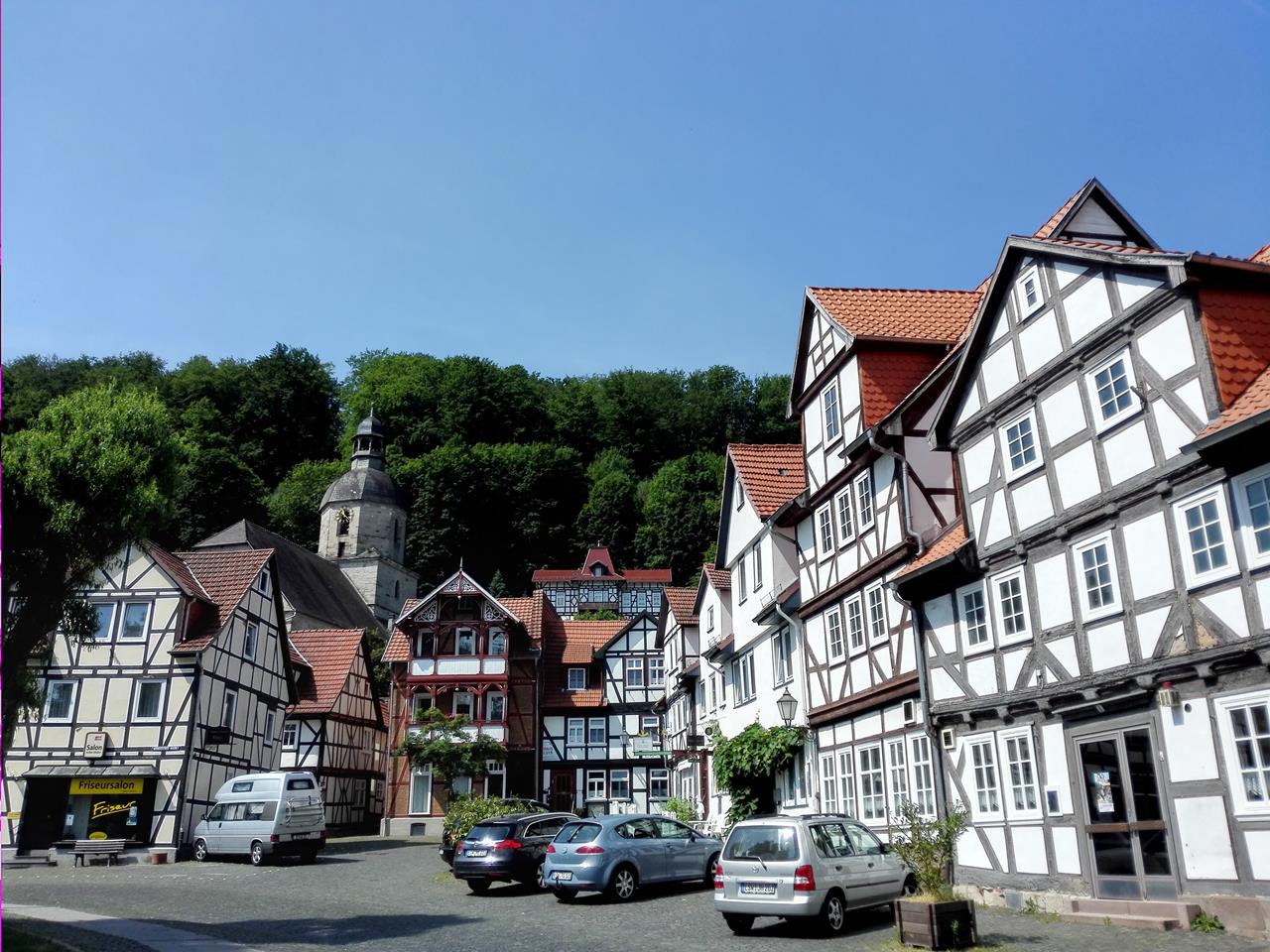 Doch im 19. Jahrhundert entwickelte sich aus der dazugehörigen Solequelle ein lebhafter Kurtourismus mit allem, was zu damaligen Zeit dazugehörte: Saline, Therme, Kurpark, Flaniermeile und vielen schmucken Pensionen in der zeitgenössischen Bäderarchitektur. Aus Sooden wurde Bad Sooden.Gleich hinter dem Ortsrand beginnt am Ahrenberg ein ausgedehntes Waldgebiet mit dem Roßkopf als höchsten Punkt. Dort hinauf folge ich mit Doxi der Tour 23 aus dem Rother-Wanderführer „Kurhessen“.