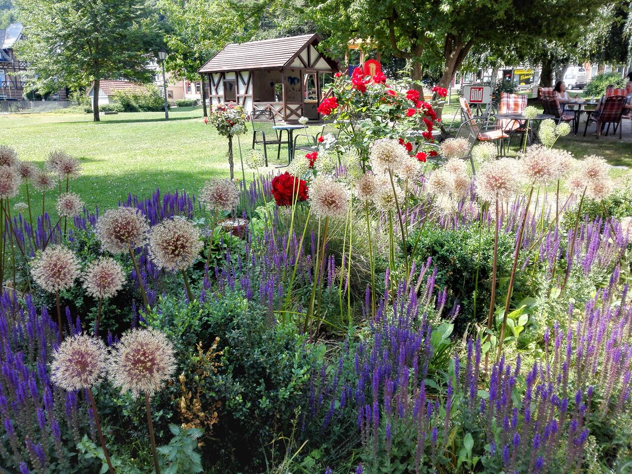 Nach wenigen Kilometern endet der Wanderweg am Ahrenberg abrupt vor der überdachten und um diese Uhrzeit gut besuchten Terrasse des gleichnamigen Waldhotels. Ich schaue ein wenig verdutzt, aber die Wanderschilder sagen eindeutig: Es geht geradeaus über die Terrasse.