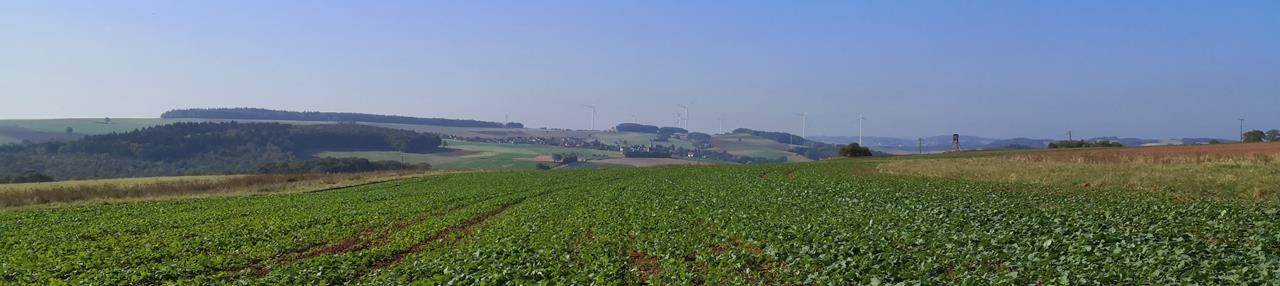 Oben auf der von Feldern durchzogenen Hochfläche kurz vor dem kleinen Ort „Hühnerhof“ angekommen, haben wir einen weiten Blick in das sanft geschwungene Nordpfälzer Bergland, auf dessen Kämmen bereits Windräder stehen.