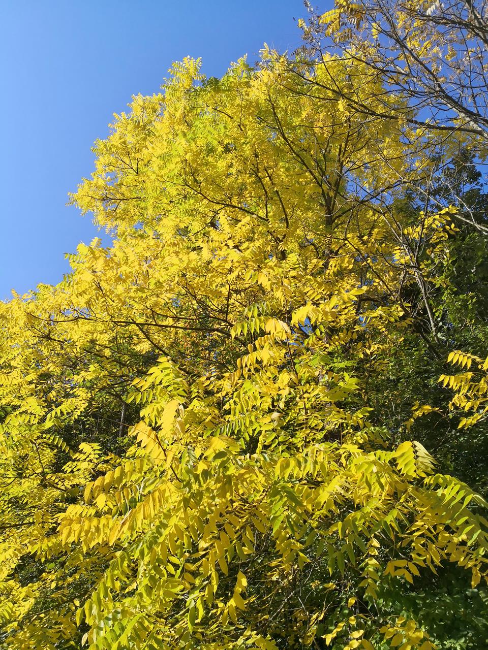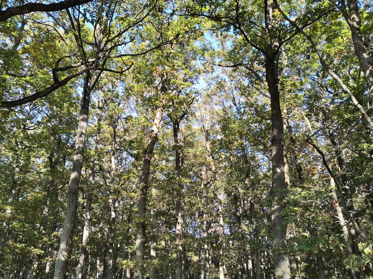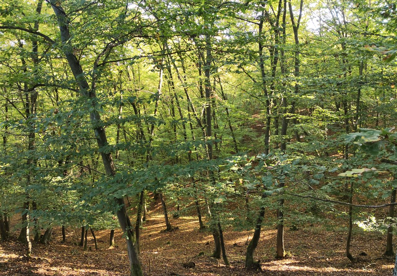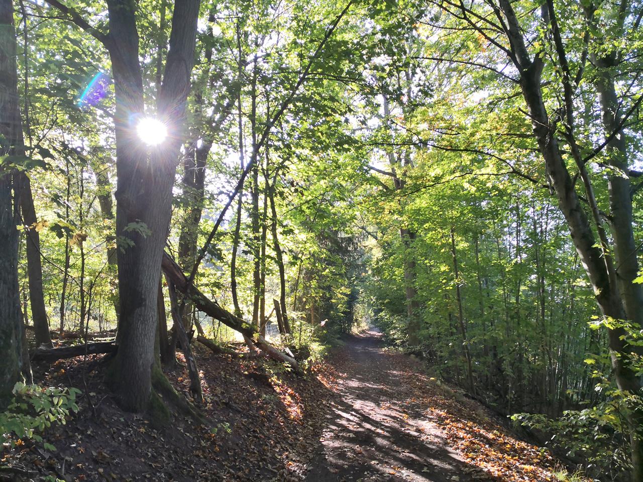 Dann steigen wir in südlicher Richtung durch den Wald am Nordhang des Nordpfälzer Berglands auf. Wir folgen dem Igelsbach und laufen durch den lichtdurchfluteten und noch satt grünen Eichen- und Buchenwald.Niemand außer uns ist hier an diesem wunderbaren Herbstmorgen unterwegs. Im Wald hören wir immer wieder Vögel singen.