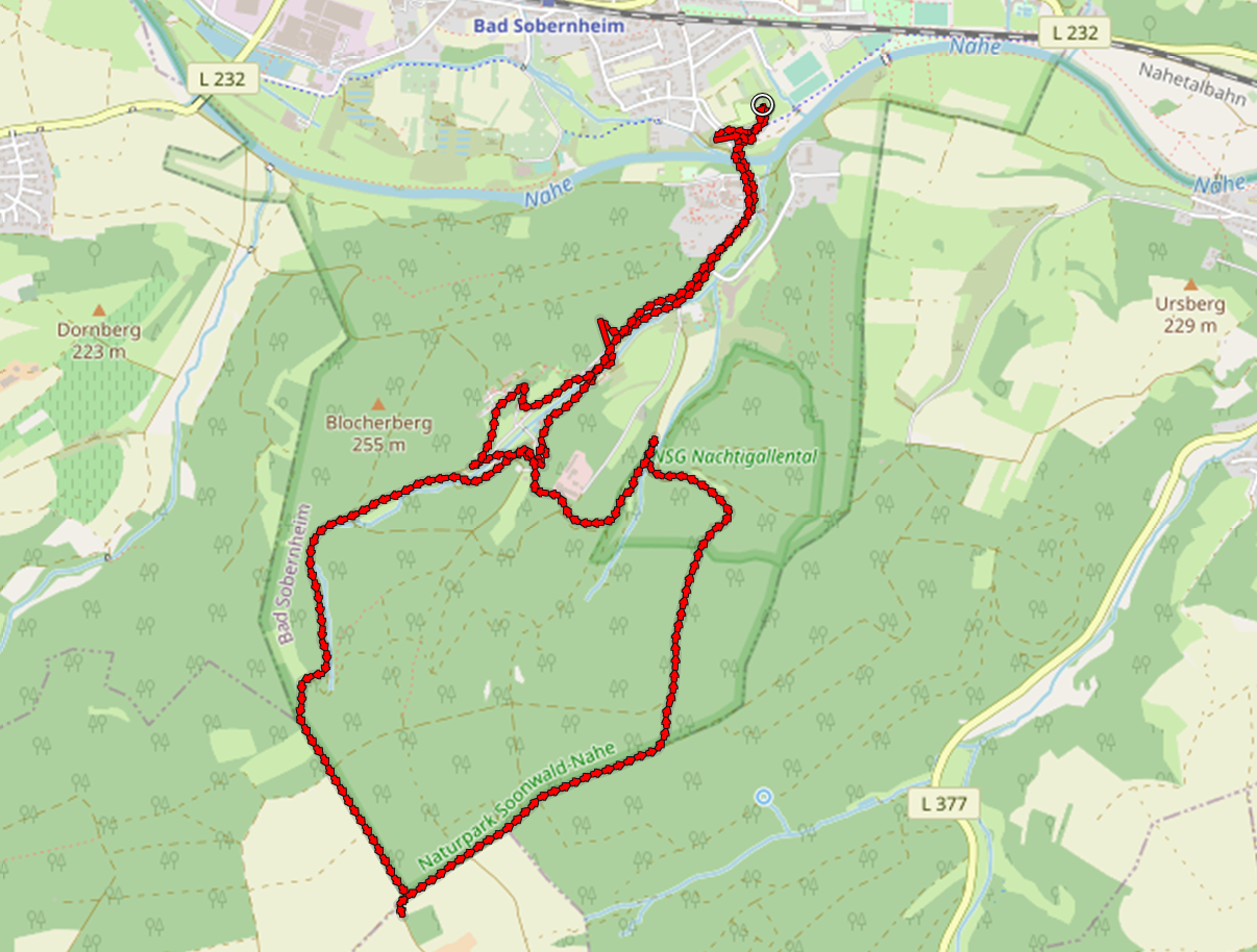 Von unserem Stellplatz in Bad Sobernheim breche ich mit Doxi zu einer Wanderung in das höher gelegene Nordpfälzer Bergland auf. Zunächst laufen wir an der Nahe entlang, die hier an vielen Stellen unter Beteiligung des NABU bereits wieder renaturiert wurde. Im Wasser spiegelt sich die noch kräftig leuchtende Herbstsonne.