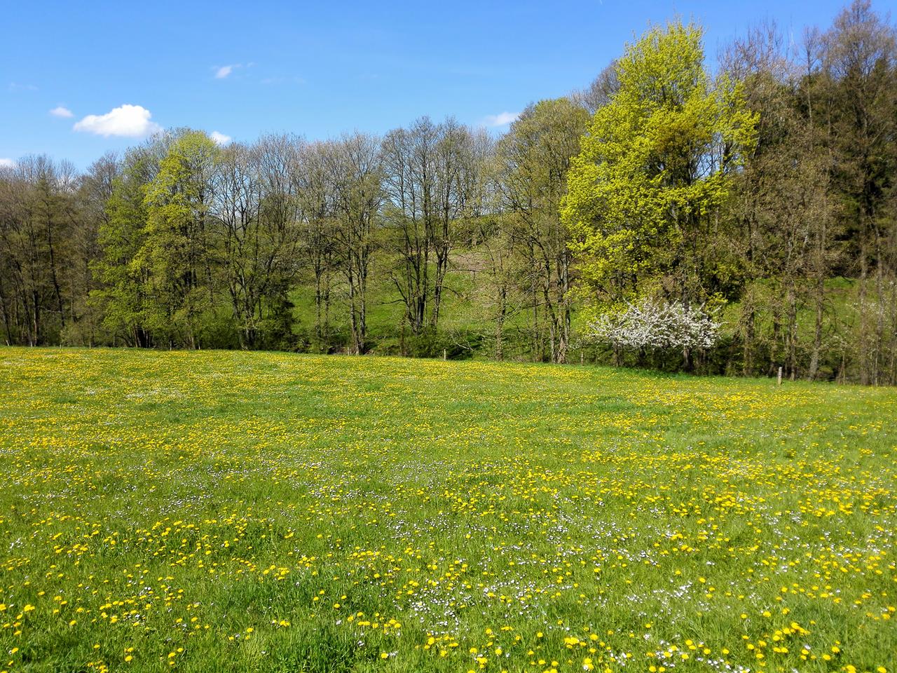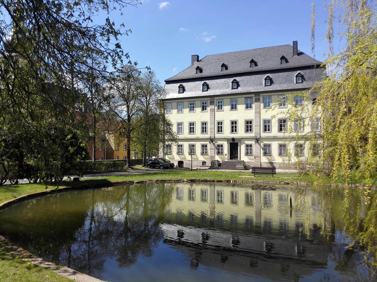 Dort angekommen spazieren wir am Ende dieser Wanderung noch ein wenig durch die Innenstadt mit der Evangelisch-Lutherische Pfarrkirche und dem Barockschloss im Schlosspark. Eine herrliche Wanderung mit wunderbaren Ausblicken über die Landschaft und die von blühendem Löwenzahn übersäten Wiesen.