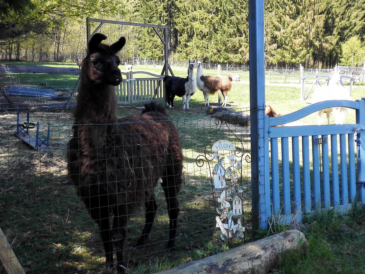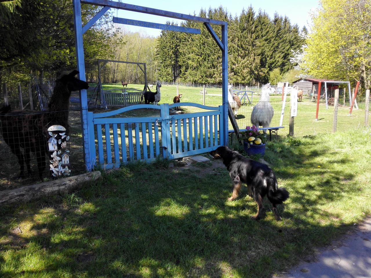 Doxi entdeckt im Wald einen kleinen Tümpel und nimmt zur Abkühlung gleich ein Fußbad. Etwas weiter treffen wir auf einen Bauernhof mit Lamas, die sehr interessant an Doxi sind, was aber auch umgekehrt gilt 🙂