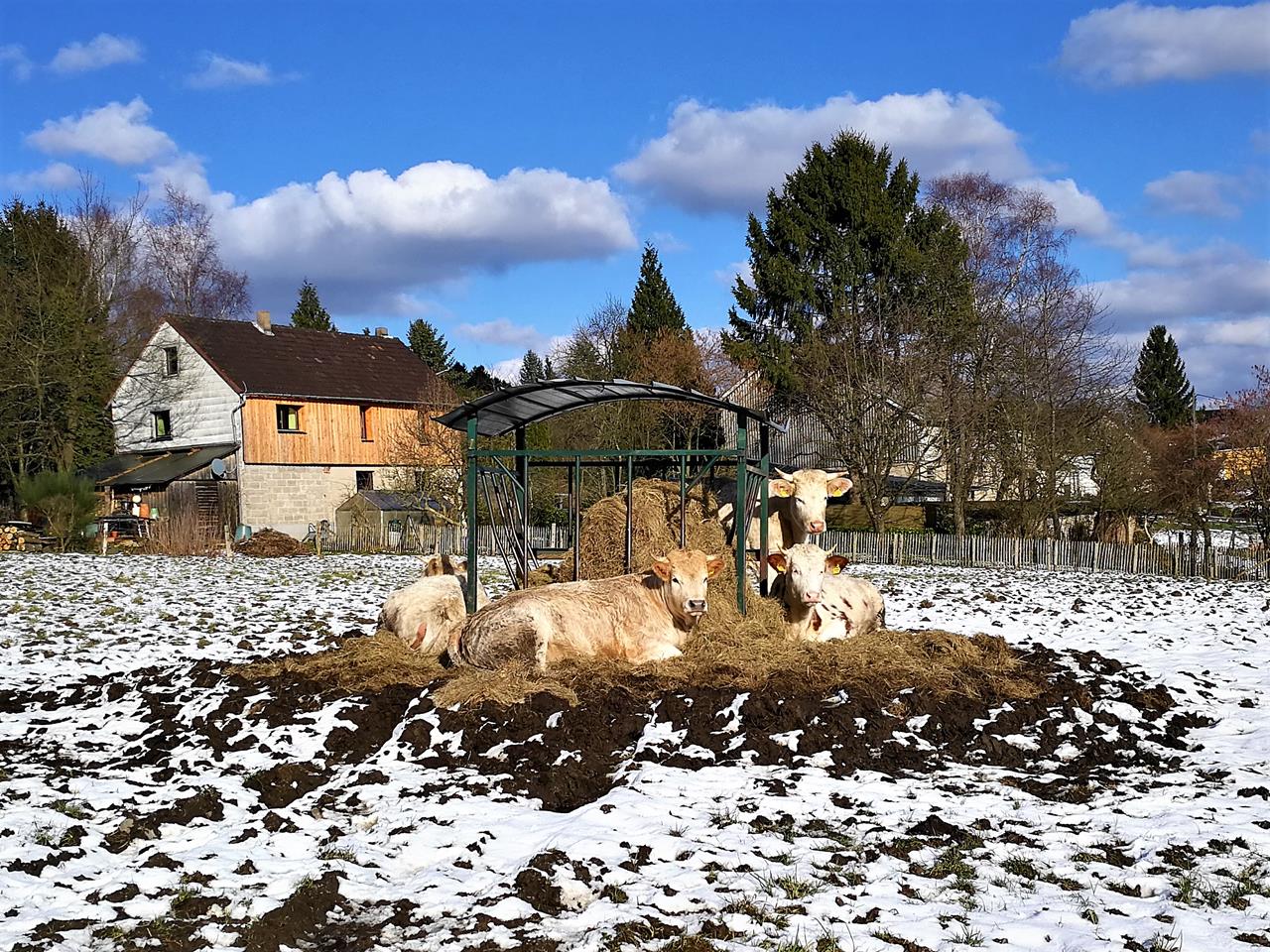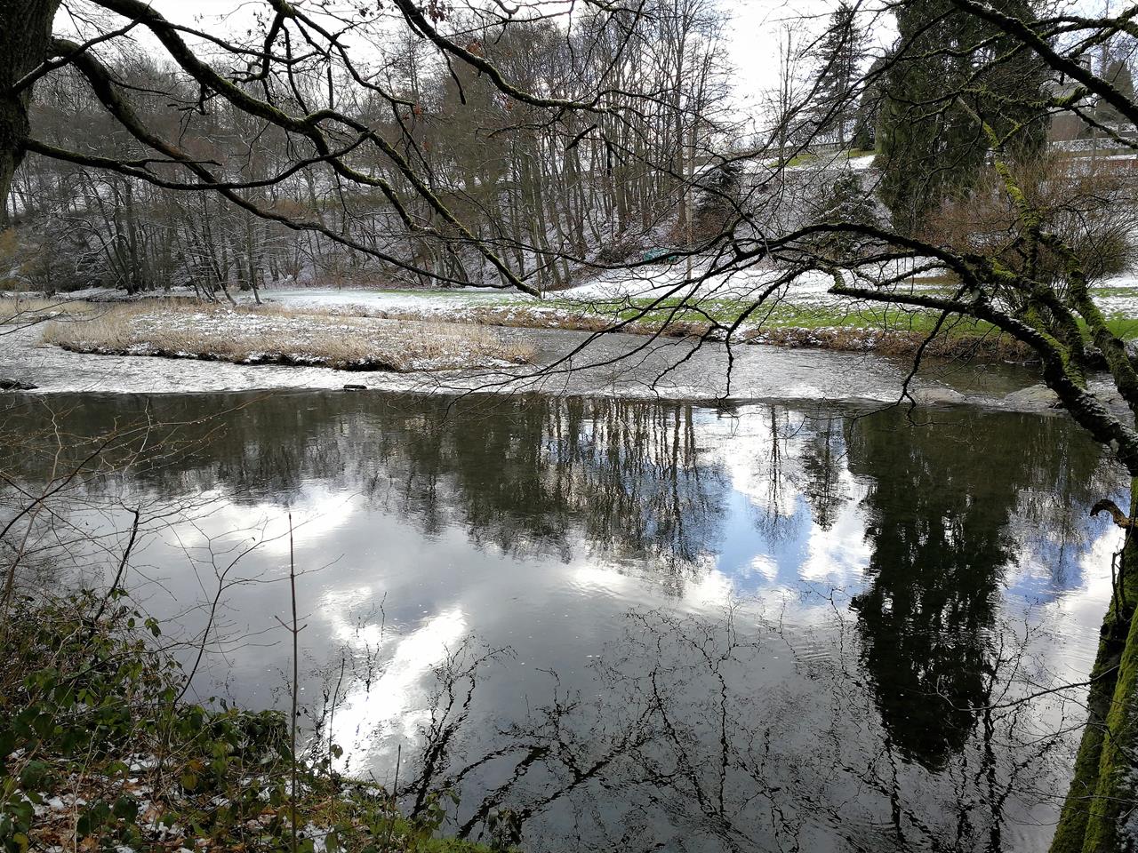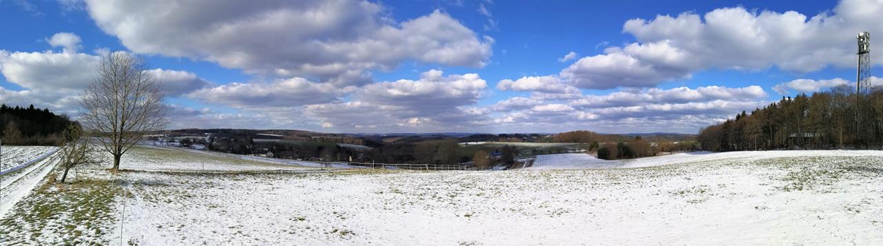 Wir folgen dabei dem Westerwaldsteig und dem Kölner Weg durch größtenteils schneebedeckte Wälder ins Tal der Großen Nister. Lediglich auf den offenen Feldflächen in Südwest-Lage ist der Schnee bereits geschmolzen.Von den Höhen oberhalb des Flusses haben wir herrliche Fernblicke in die Kroppacher Schweiz. Bald geht es steil bergab durch einen knorrigen Eichenwald zum Ufer der Nister und dort scharf nach rechts.