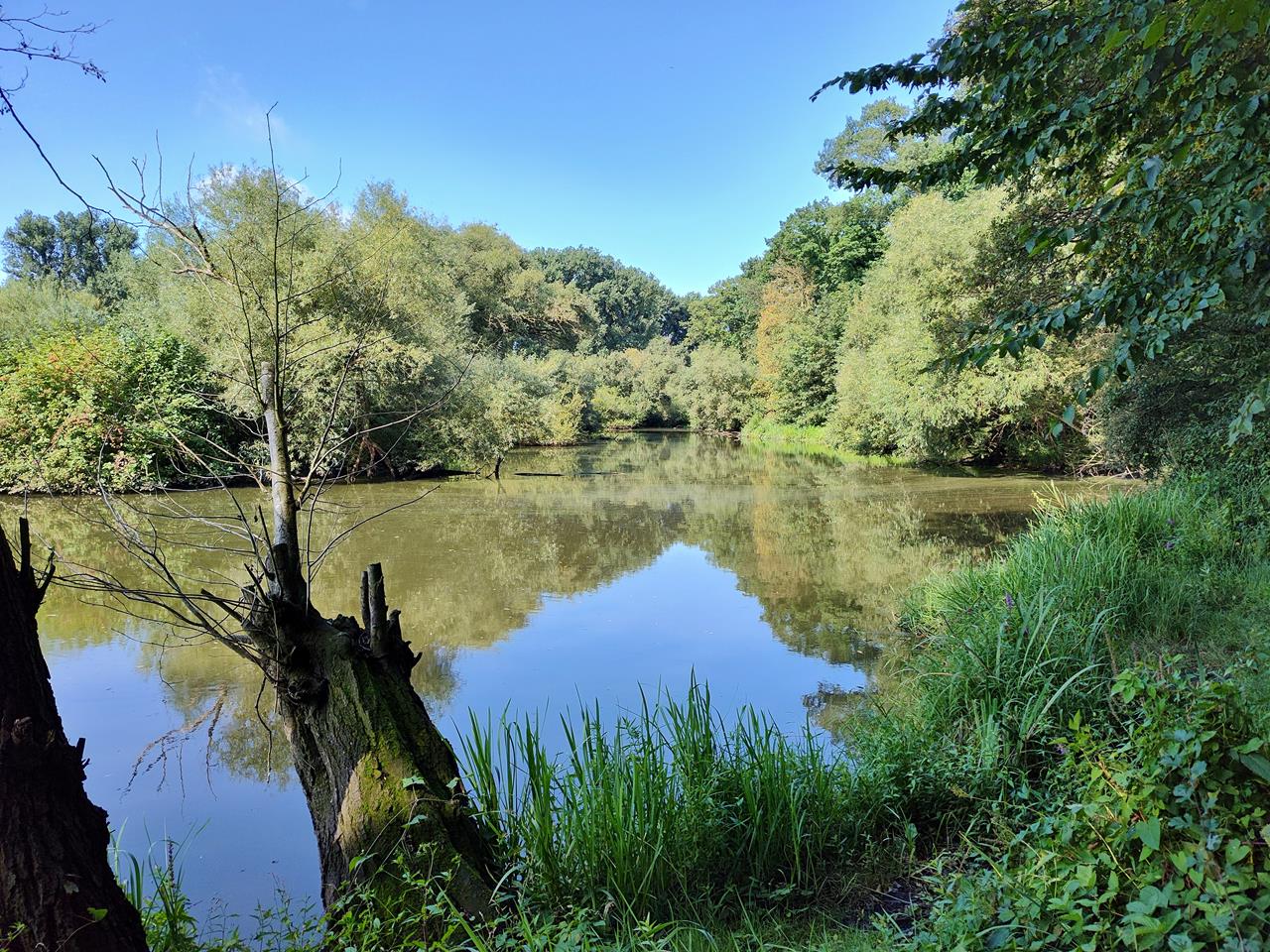 Von Rurkempen ging es auf einer Strecke von 13 km immer an der Rur entlang, teilweise über Schotterwege, teilweise über zugewachsene Pfade.Der Fluss führt uns zunächst in nördlicher Richtung bis zum Effelder Waldsee, der die Grenze zu den Niederlanden bildet.