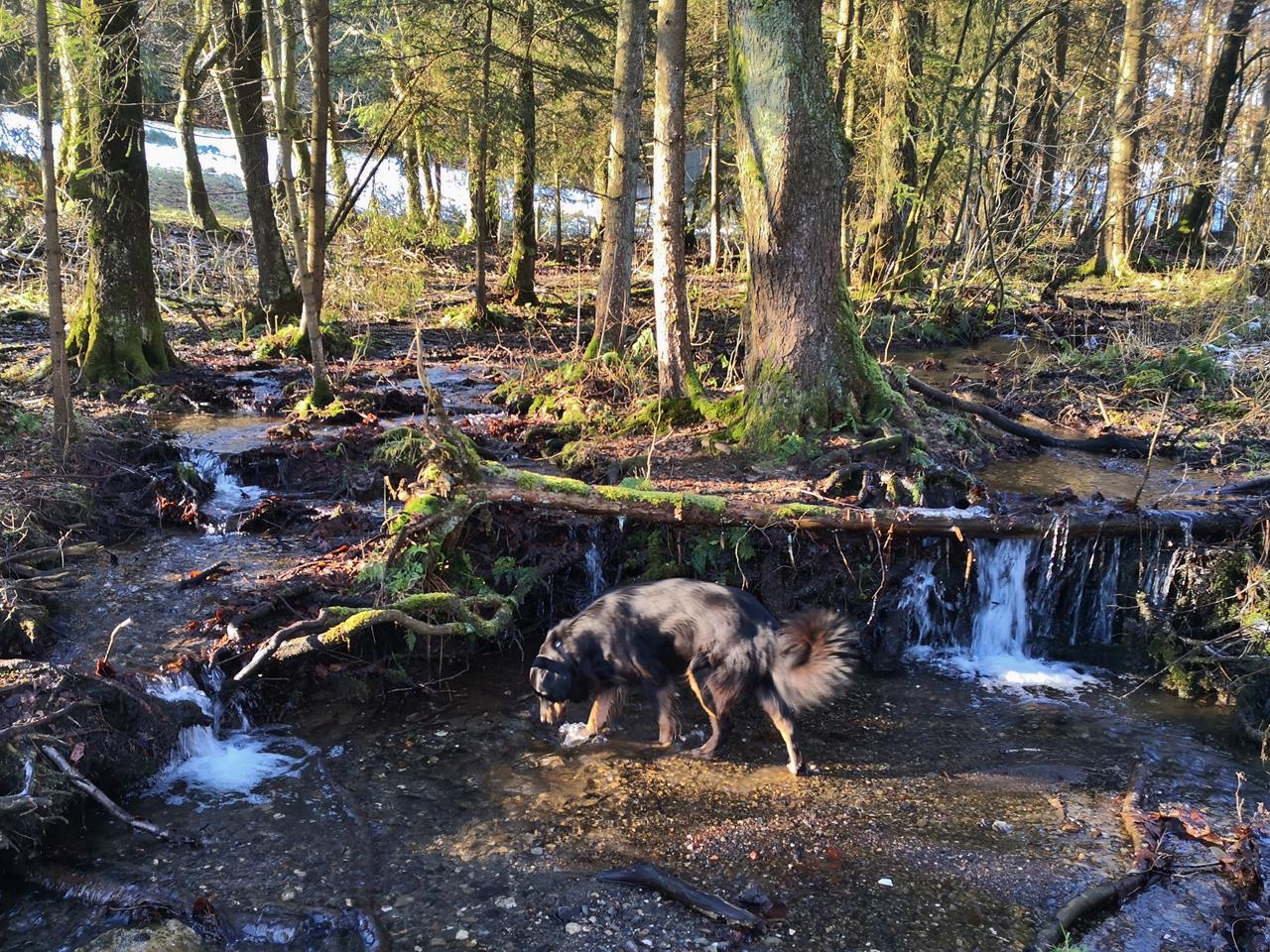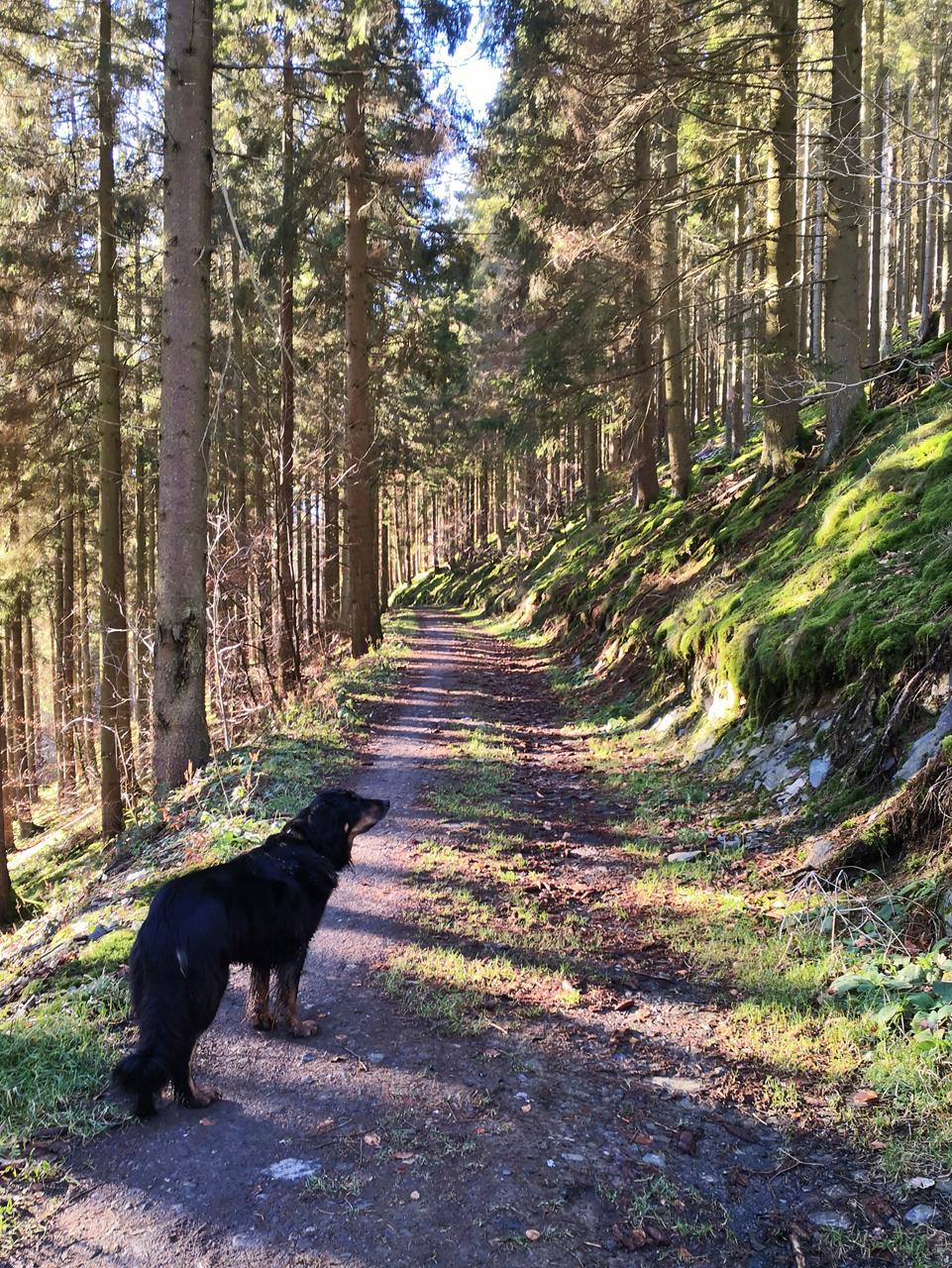 Wir lassen uns viel Zeit und genießen die Sonnenstrahlen auf unseren Gesichtern. Für uns ist es der erste Schnee in diesem Jahr, und auch Doxi hat wie immer unheimlich viel Spaß, sich auf dem weißen Untergrund abzurollen. So macht das Winterwandern richtig Freude.