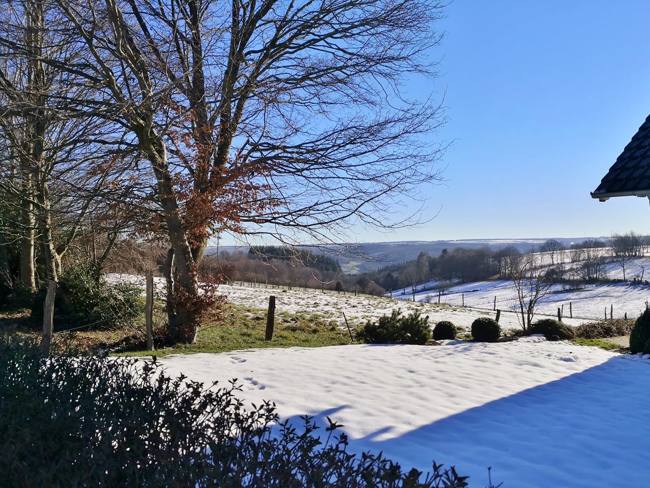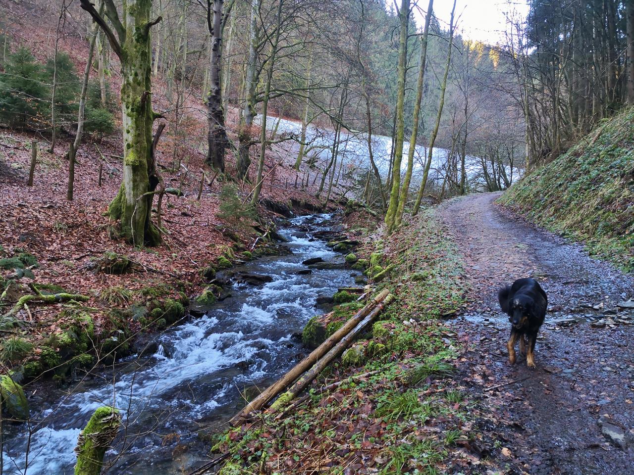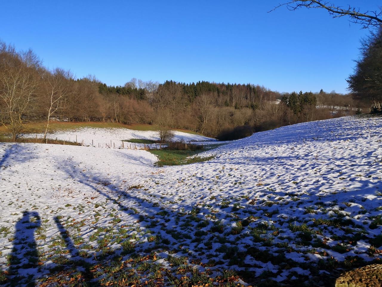 Noch einmal Sonne in der Nordeifel. Heute wandern Heike und ich auf einer 11 km langen Tour von Simmerath zunächst durch eine noch halb schneebedeckte Landschaft in den Nachbarort Huppenbroich. Dahinter steigen wir in das Brombachtal hinab, wo der Brombach auf das Rurtal trifft und in die noch junge Rur mündet.