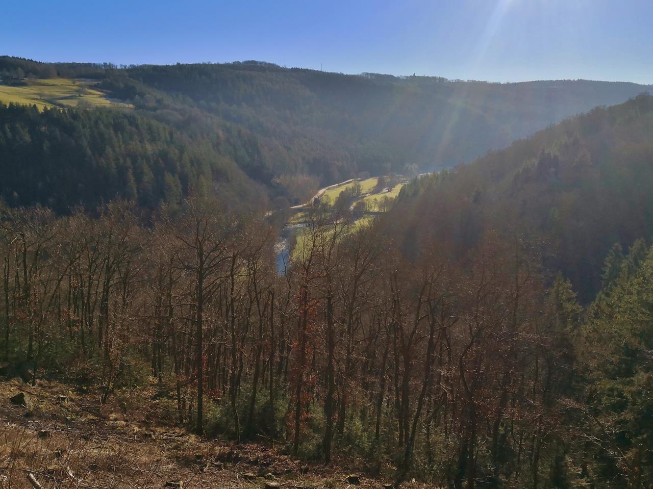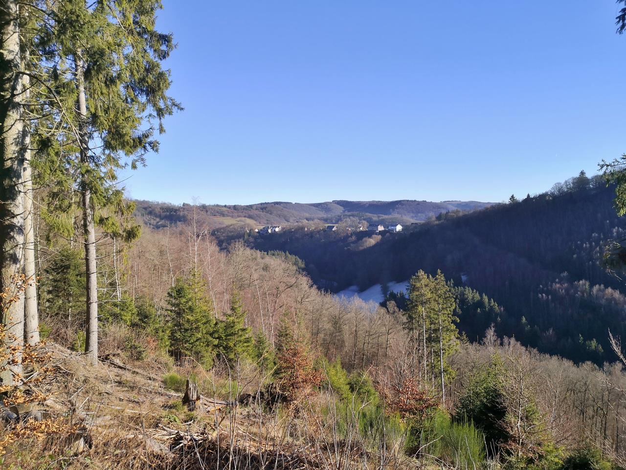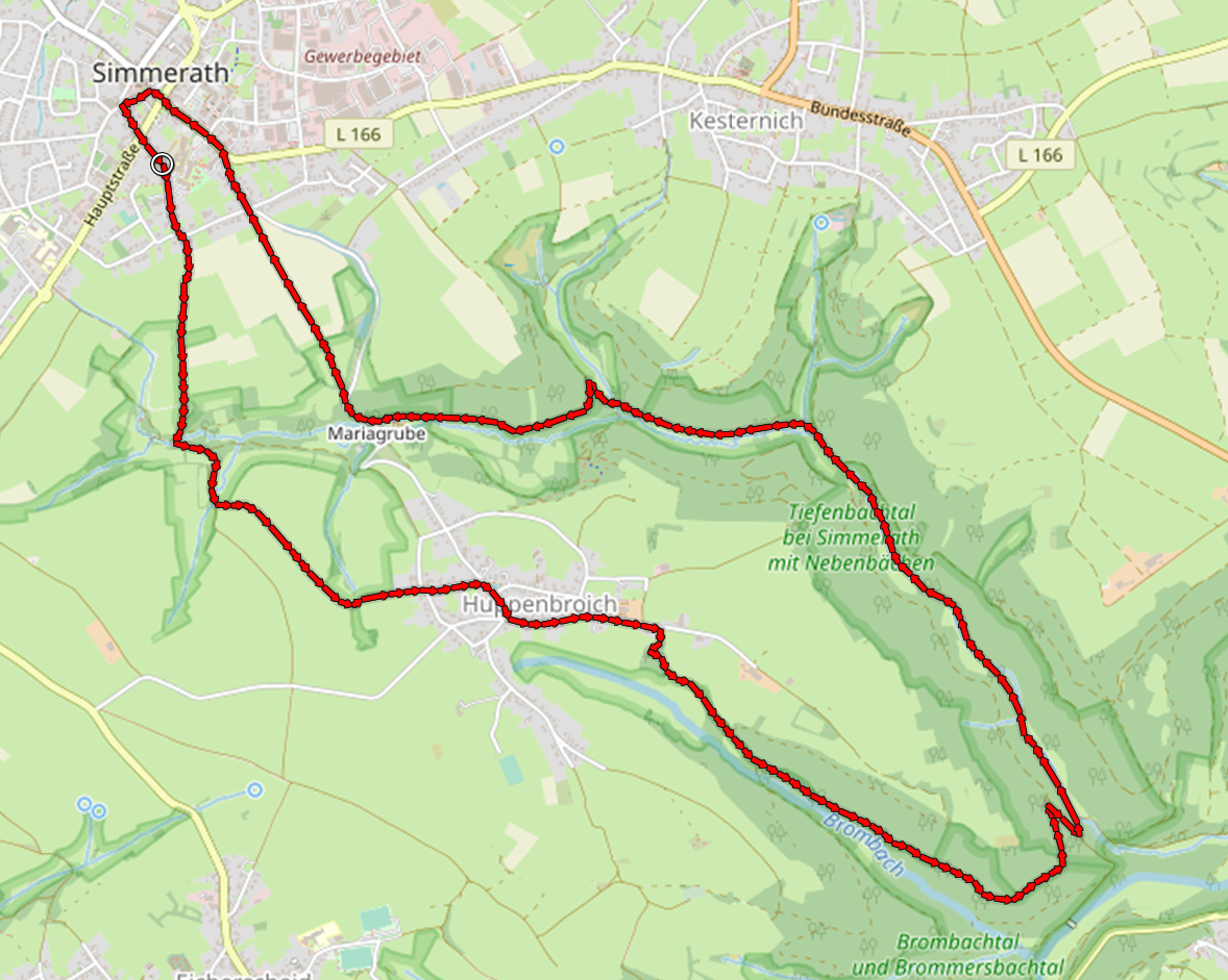 Noch einmal Sonne in der Nordeifel. Heute wandern Heike und ich auf einer 11 km langen Tour von Simmerath zunächst durch eine noch halb schneebedeckte Landschaft in den Nachbarort Huppenbroich. Dahinter steigen wir in das Brombachtal hinab, wo der Brombach auf das Rurtal trifft und in die noch junge Rur mündet.