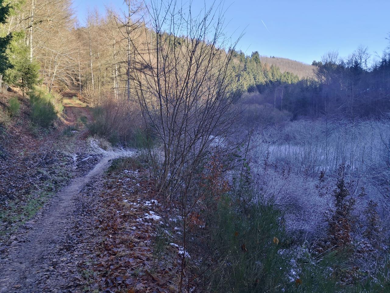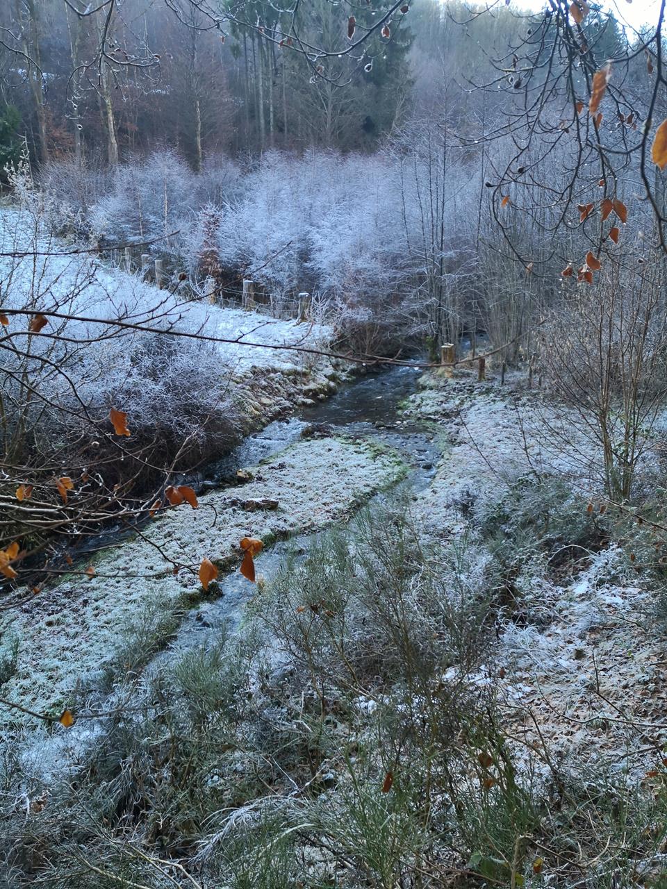Am Talgrund wechseln wir ins malerische Tiefenbachtal. Dort folgen wir dem lieblich rauschenden Tiefenbach durch den eisigen Talgrund stromaufwärts wieder zurück hinauf nach Simmerath.Die Tour ist ein krasses Wechselspiel der Farben: Auf der Nordseite der Täler liegt noch Schnee. Reif kleidet die Pflanzen und Sträucher in ein zuckriges Gewand.