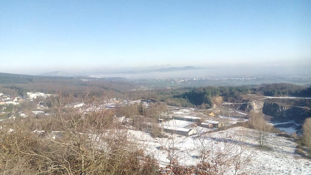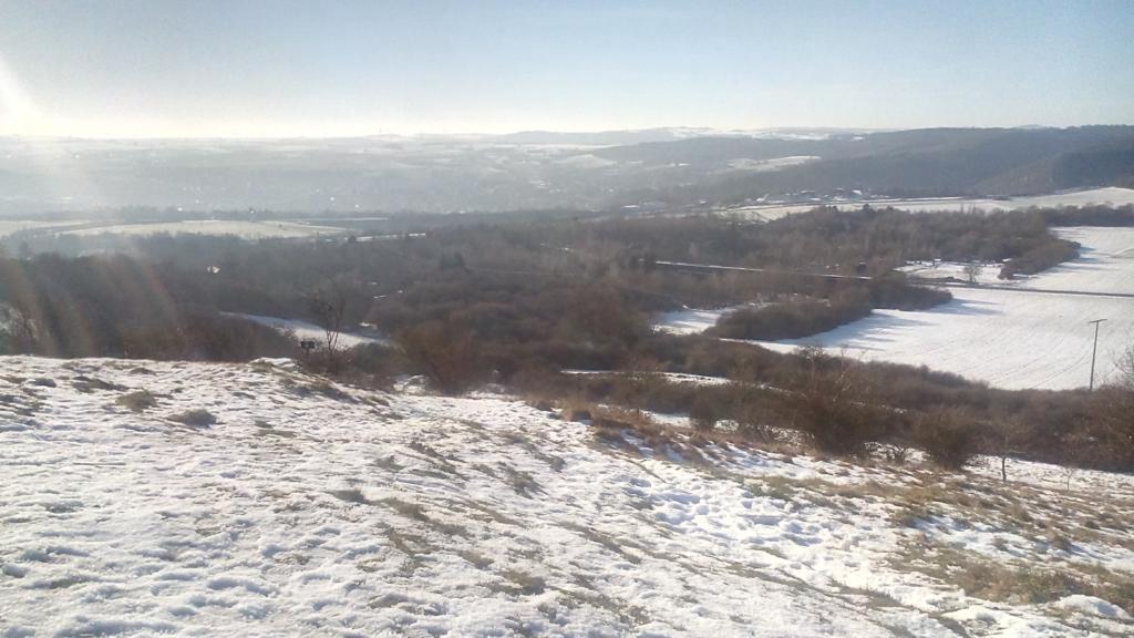 Das Wetter ist fantastisch: Sonne und wunderbarer Fernblick. Die Höhenlagen der Vulkaneifel sind noch mit Schnee bedeckt, beim Blick nach Osten Richtung Rheintal wird es jedoch bald grün.Leider entpuppt sich der Schnee unter unseren Füßen schnell als wiedergefrorener Schneematsch: Hart, spitz und glatt.