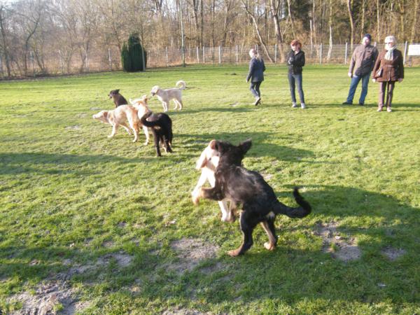 Nachdem alle ihre Hunde von der Leine gelassen hatten, gab es in den ersten Minuten durchaus einige Zankereien, doch schnell entwickelte sich ein munteres und entspanntes Spiel in immer wechselnden Paarungen: Nachlaufen, Weglaufen, den anderen anspringen oder auch mal dominieren – das ganze Programm eben.