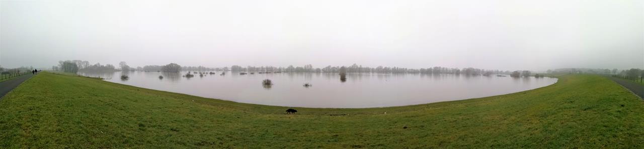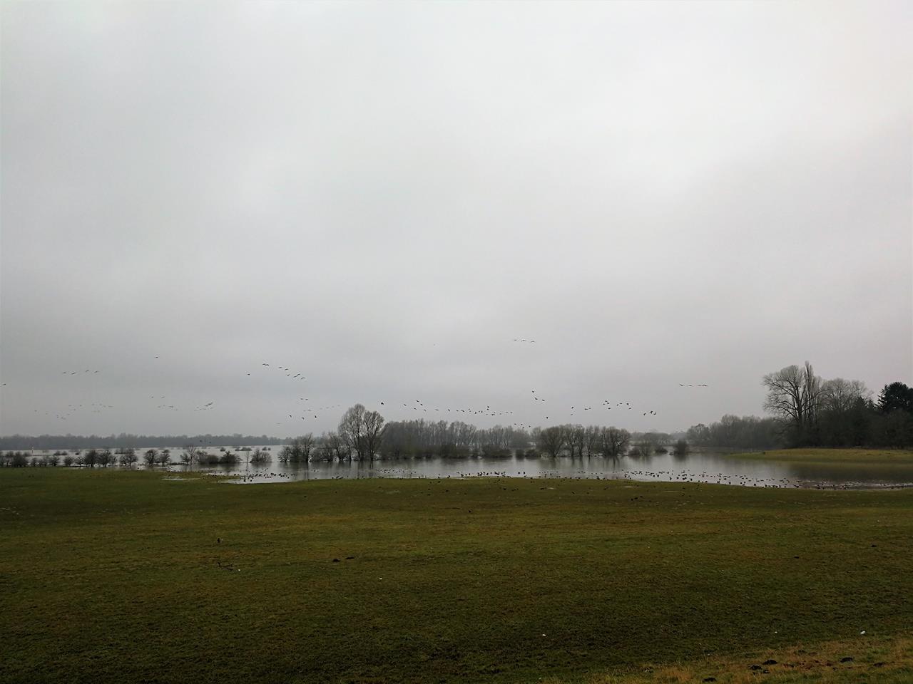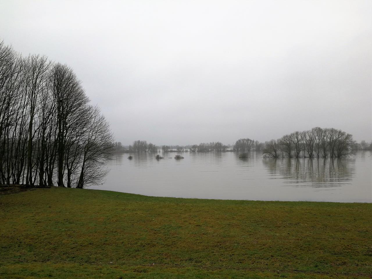 Der See liegt nordwestlich der Innenstadt von Wesel und wird im Süden und Westen vom Rhein begrenzt, der gerade Hochwasser führt.Vom Deich zwischen dem Rhein und dem Auesee hat man einen imposanten Blick auf die großen überfluteten Flächen in den Rheinauen.