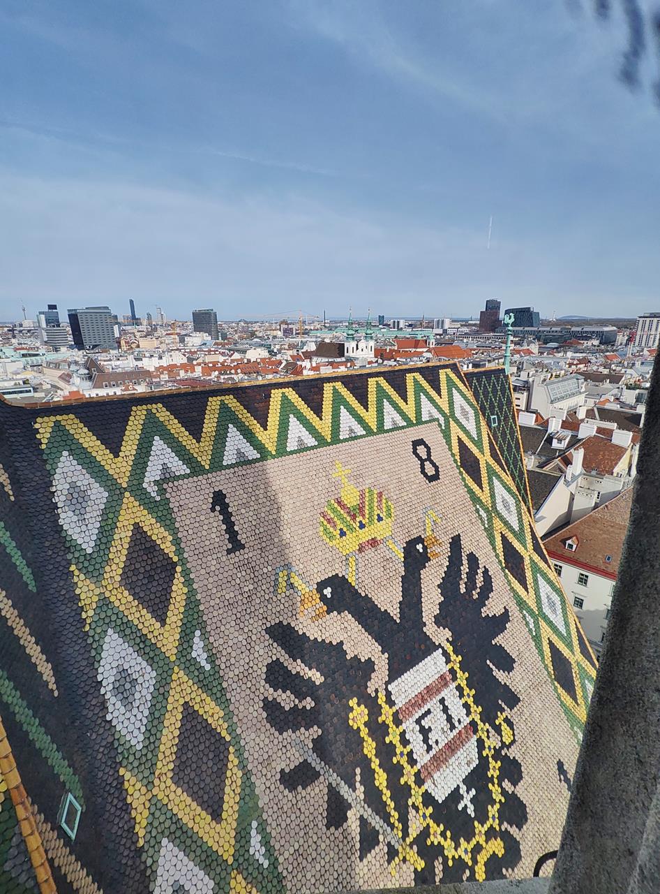 Oben angekommen, blickt man nicht nur in allen vier Himmelsrichtungen auf die Stadt, sondern kann auch die markant gemusterten Dachflächen des Doms aus nächster Nähe betrachten. Also, sobald man wieder die Luft dafür hat und der Treppenschwindel vorüber ist 🙂