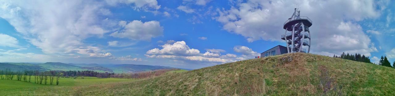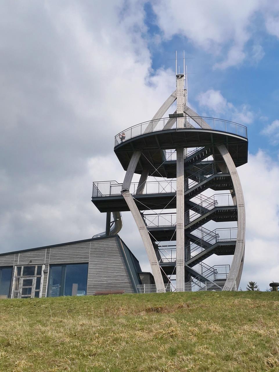 Ich stehe mit dem Womo am Ellenbogen, einem 813 m ü.N.N. hohen Berg im Landkreis Schmalkalden-Meiningen. Untere Teile seiner Flanken liegen in Bayern und Hessen.Seit 2017 gibt es hier auf dem Gipfel den Aussichtsturm „Noahs Segel“ mit Rutsche und Ausstellungsgebäude.