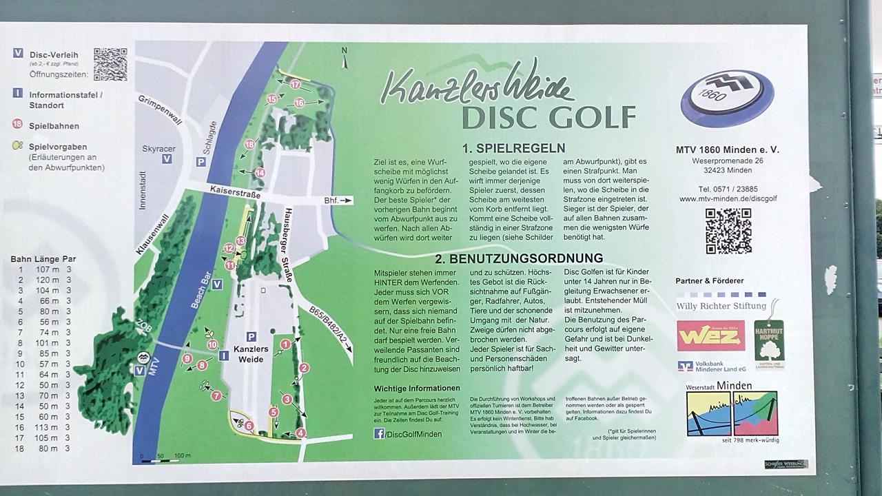 Dort hat der Fluss in Jahrtausenden (Jahrmillionen?) eine Bresche in das Gebirge geschlagen, um in das Norddeutsche Tiefland überzugehen und seinen Weg Richtung Nordsee fortzusetzen.Auf den Wiesen rund um den Stellplatz hat die Stadt Minden einen Parcours für Disc-Golf eingerichtet. Am Rande bekomme ich mit, wie sich einige Wohnmobilisten beschweren, dass die Frisbees der jungen Leute auf ihren Wohnmobilen gelandet seien 🙂