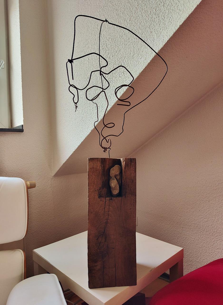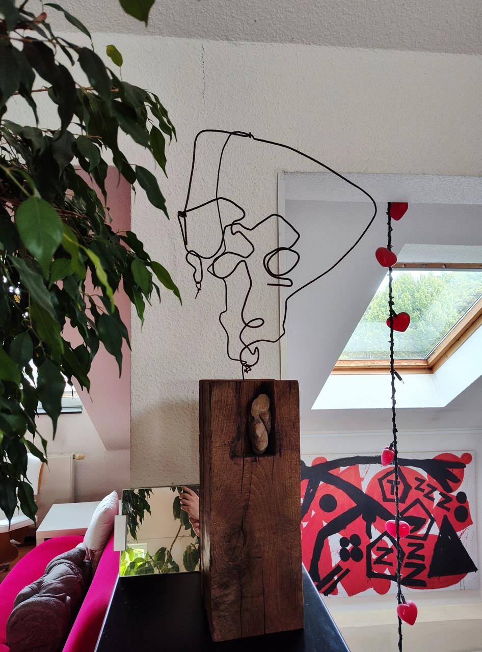 Nun habe ich mir so ein feines kleines Kunstwerk aus Finca-Draht und Holz gegönnt, aber jetzt weiß ich gar nicht so genau, wohin damit. Platz ist eigentlich genug da, aber der ist natürlich schon ordentlich vollgestellt. Da müsste also etwas Anderes weg.