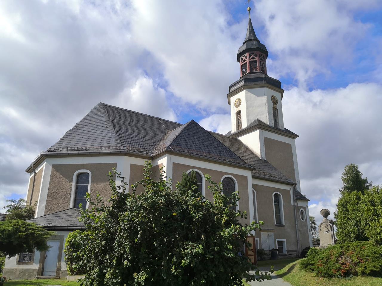 Gleich hinter der imposanten Eisenbahnbrücke laufen wir durch einen schönen Wiesengrund und passieren dabei die Landesgrenze zwischen Sachsen und Thüringen.Auf Thüringer Seite steigen wir anschließend durch Feldflächen hinauf auf die Hochfläche über dem Göltzschtal zum Ort Reinsdof mit seiner schönen Dorfkirche.