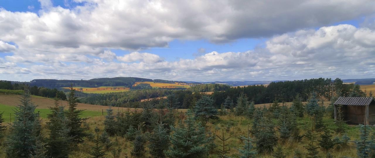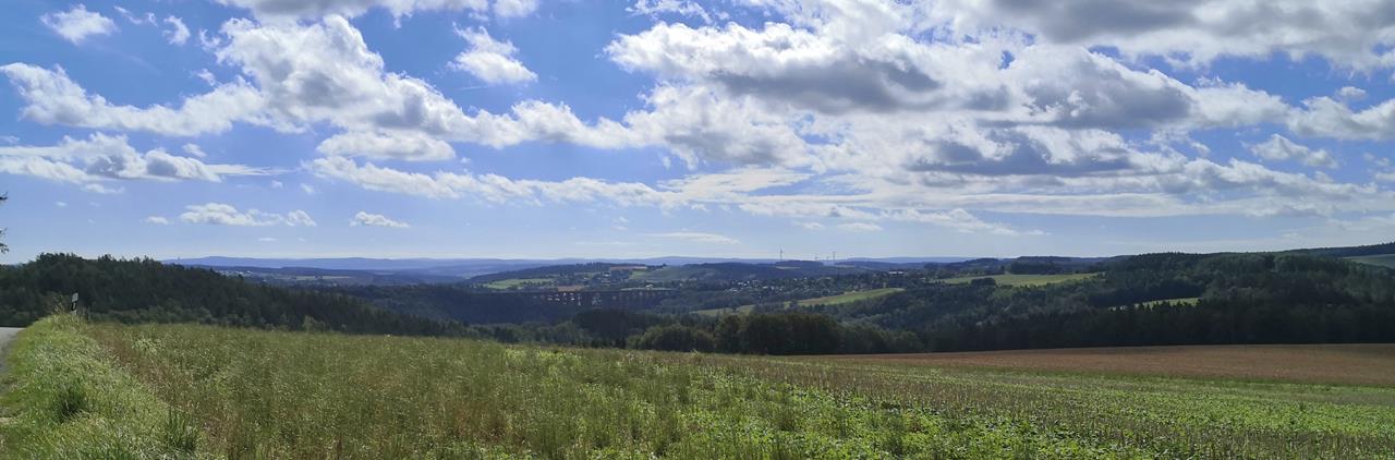 Vor und hinter Reinsdorf genießen wir herrliche Fernblicke in die hügelige Landschaft des Vogtlands, wo sich Felder und Wälder und einem leuchtend blauen Himmel abwechseln.