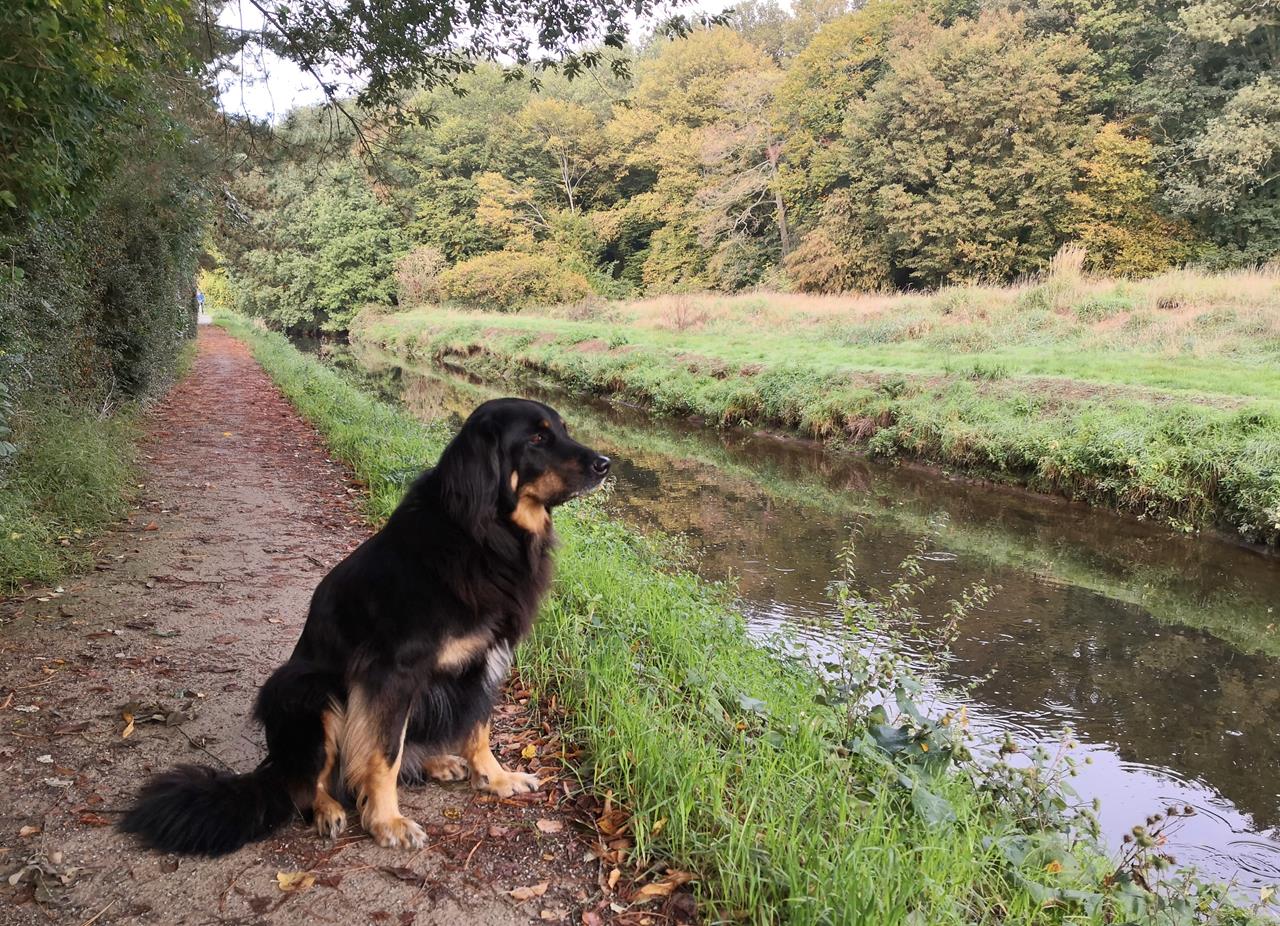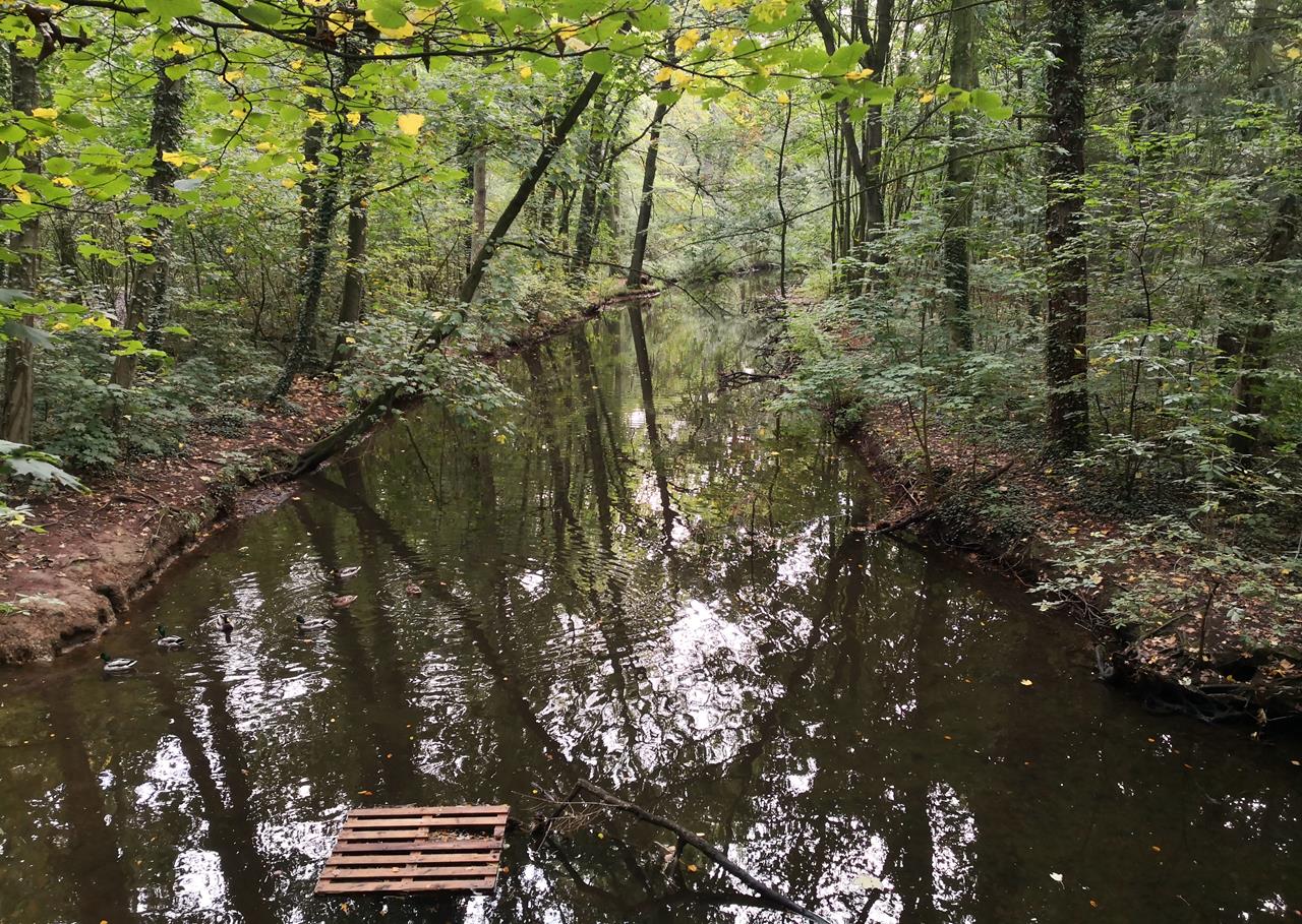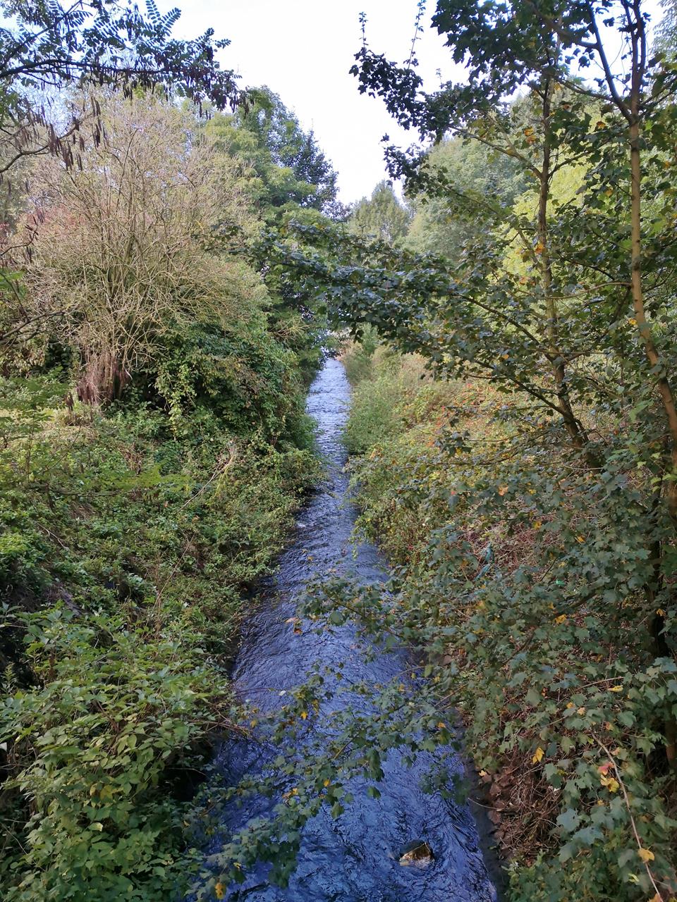 Heute, am 29. Jahrestag der deutschen Einheit, war ich mit Doxi auf einer wasserreichen Wanderung in Dinslaken, im Nordwesten des Ruhrgebietes, unterwegs. Wir starten an der Bezirkssportanlage etwas abseits des historischen Ortszentrums und befinden uns sogleich am Rotbach, dem wir über mehrere Kilometer bis zu seiner Mündung in den Rhein folgen.